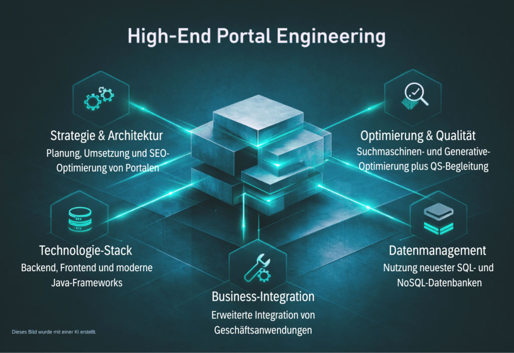 Durch diese Methodik entstehen Portale, die technisch sauber mit der bestehenden Systemlandschaft verwoben sind und gleichzeitig leistungsfähige Geschäftsanwendungen als native Bestandteile nutzen – was Betrieb, Skalierbarkeit und Weiterentwicklung vereinfacht.